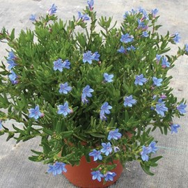 `Heavenly Blue` is an evergreen, rockery plant with rounded growth habit. It has green foliage and star shaped, vivid blue flowers. It grows up to 15cm (6") high and spreads to 25cm (10") wide. The plant is native to Spain.